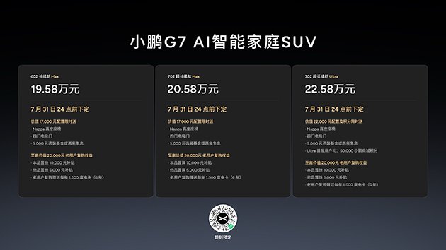 iMobile 爱科技7月3日讯——小鹏汽车讲求发布全新AI智能家庭SUV——小鹏G7。新车共推出602长续航Max、702超长续航Max、702超长续航Ultra三个版块,官方指挥售价远隔为19.58万元、20.58万元和22.58万元,上市即委派。