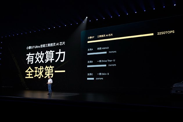 小鹏G7 Ultra首发搭载3颗图灵AI芯片,是各人首颗同期足下在AI汽车、AI机器东说念主、震动汽车的芯片,并专为AI大模子定制,有用算力“一颗顶三颗”主流芯片。整车有用算力高达2250TOPS,跃居各人第一,是行业旗舰的3-28倍。此外,小鹏G7 Ultra竣事了行业初度“一舱双旗舰芯”设立,各人初度加多座舱专属图灵AI芯片,智能座舱AI有用算力达800+TOPS,比行业旗舰车型大26倍。